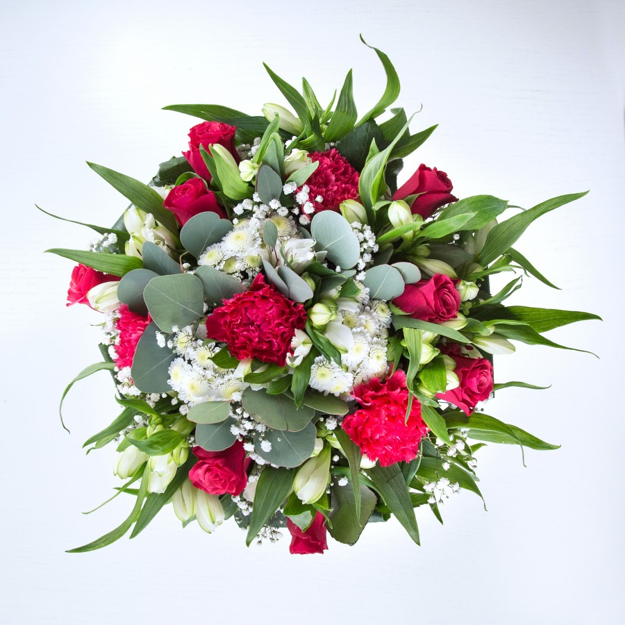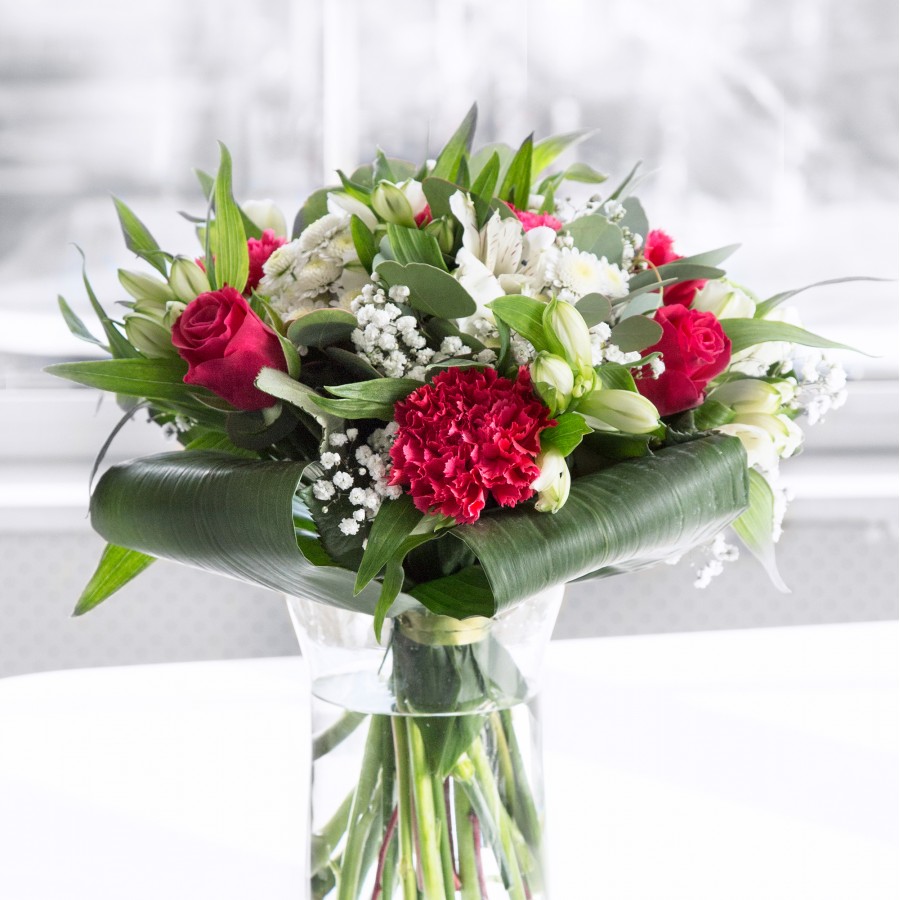Indulge in the timeless beauty of our unique bouquet, meticulously crafted to inspire and captivate. This stunning arrangement features vibrant red roses paired with sweet white chrysanthemums and delicate gypsophila, enhanced by lively carnations and pristine white alstroemeria. The addition of aspidistra leaves adds depth and elegance to the overall design.