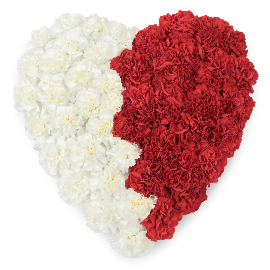 Embrace the grace and charm of our heart-shaped arrangement, featuring exquisite white and red carnations. Each flower is carefully selected to guarantee ultimate freshness and stunning beauty.