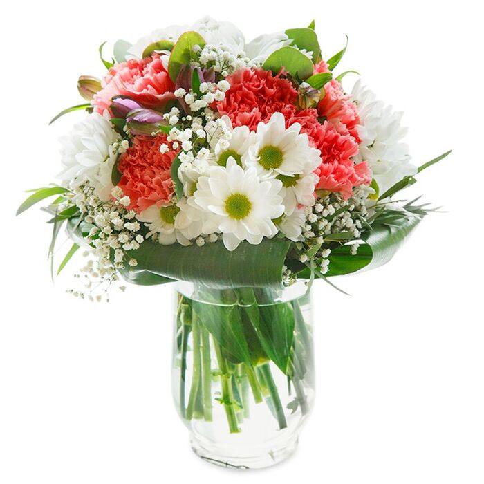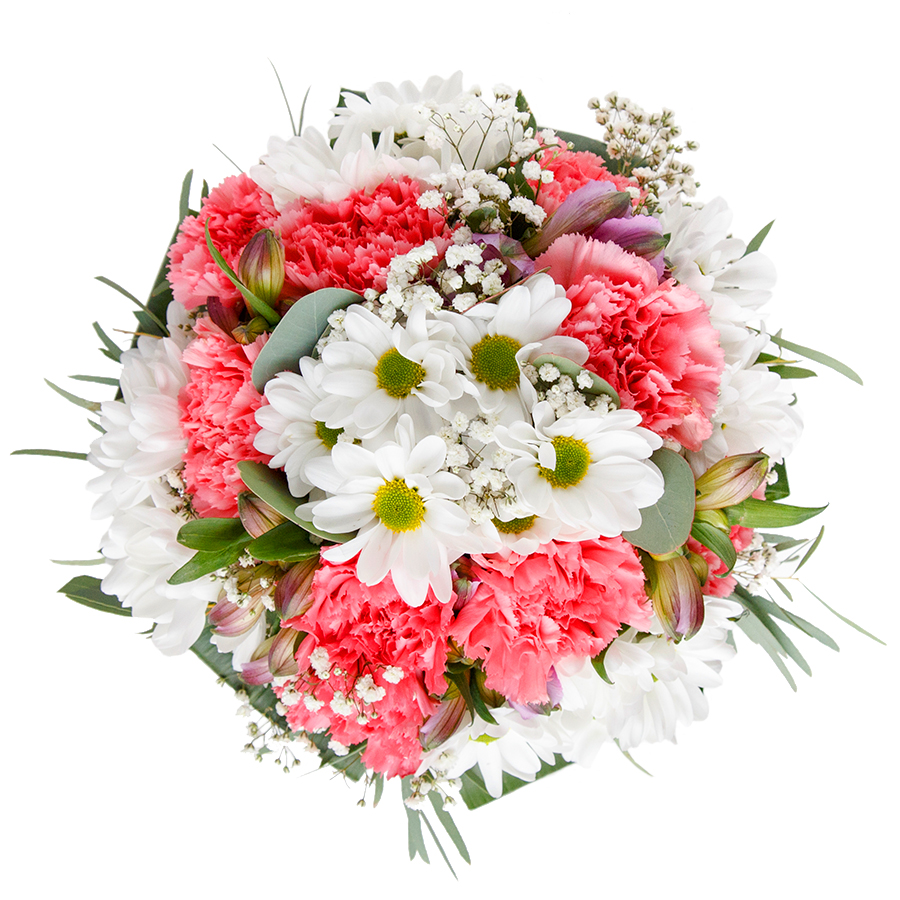 Welcome the charm of nature with our Charming Petals Ensemble—an arrangement that fuses modern aesthetics with timeless elegance. This bouquet features a layering of pristine white chrysanthemums, delicate gypsophila, and soft, blush light pink carnations, elegantly arranged with vibrant aspidistra leaves. Each flower is hand-picked to deliver an unmatched freshness and beauty ideal for festive celebrations or heartfelt surprises.